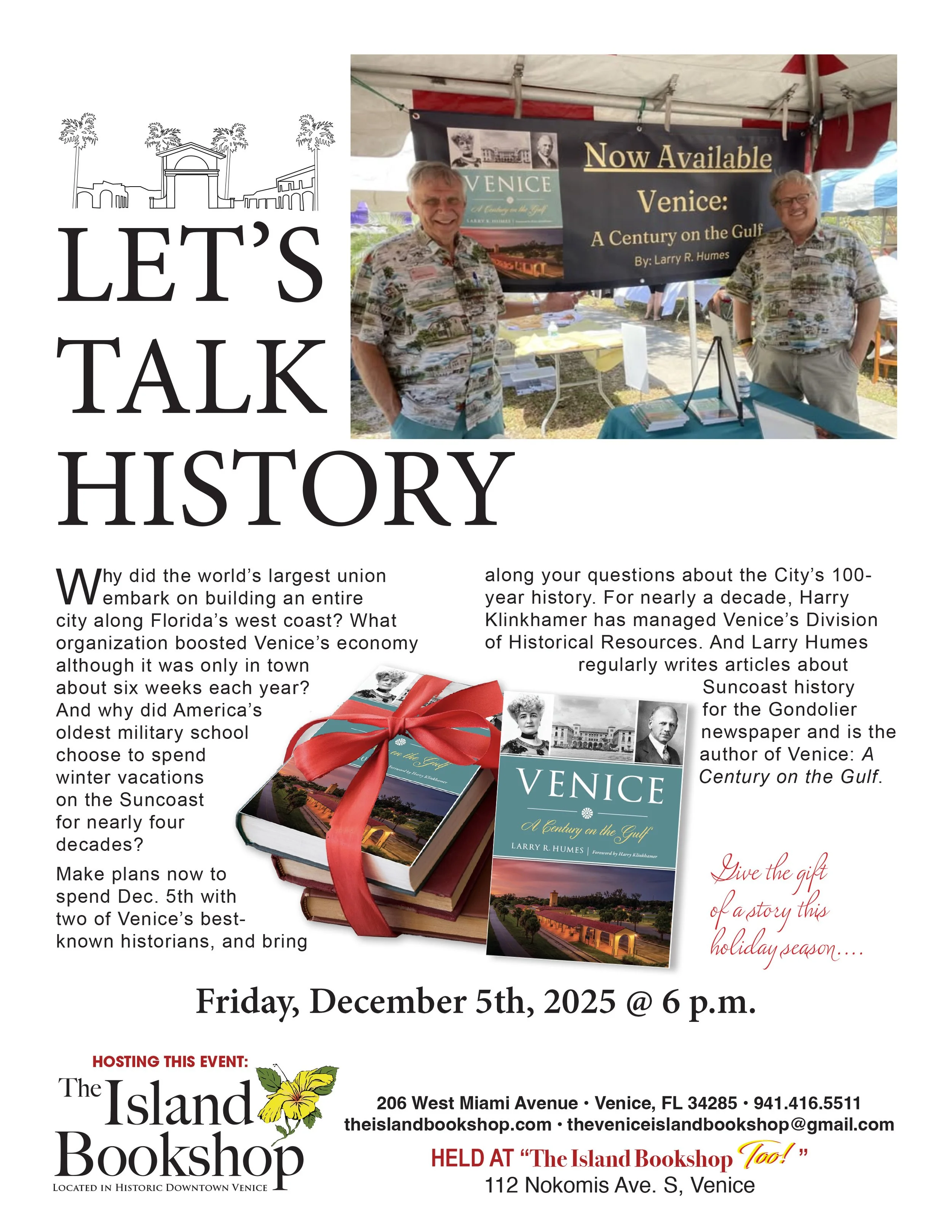 Back to All Events Let’s Talk History Friday, December 5, 2025 6:00 PM 7:30 PM The Island Bookshop 206 Miami Avenue West Venice, FL, 34285 United States (map) Google Calendar ICS