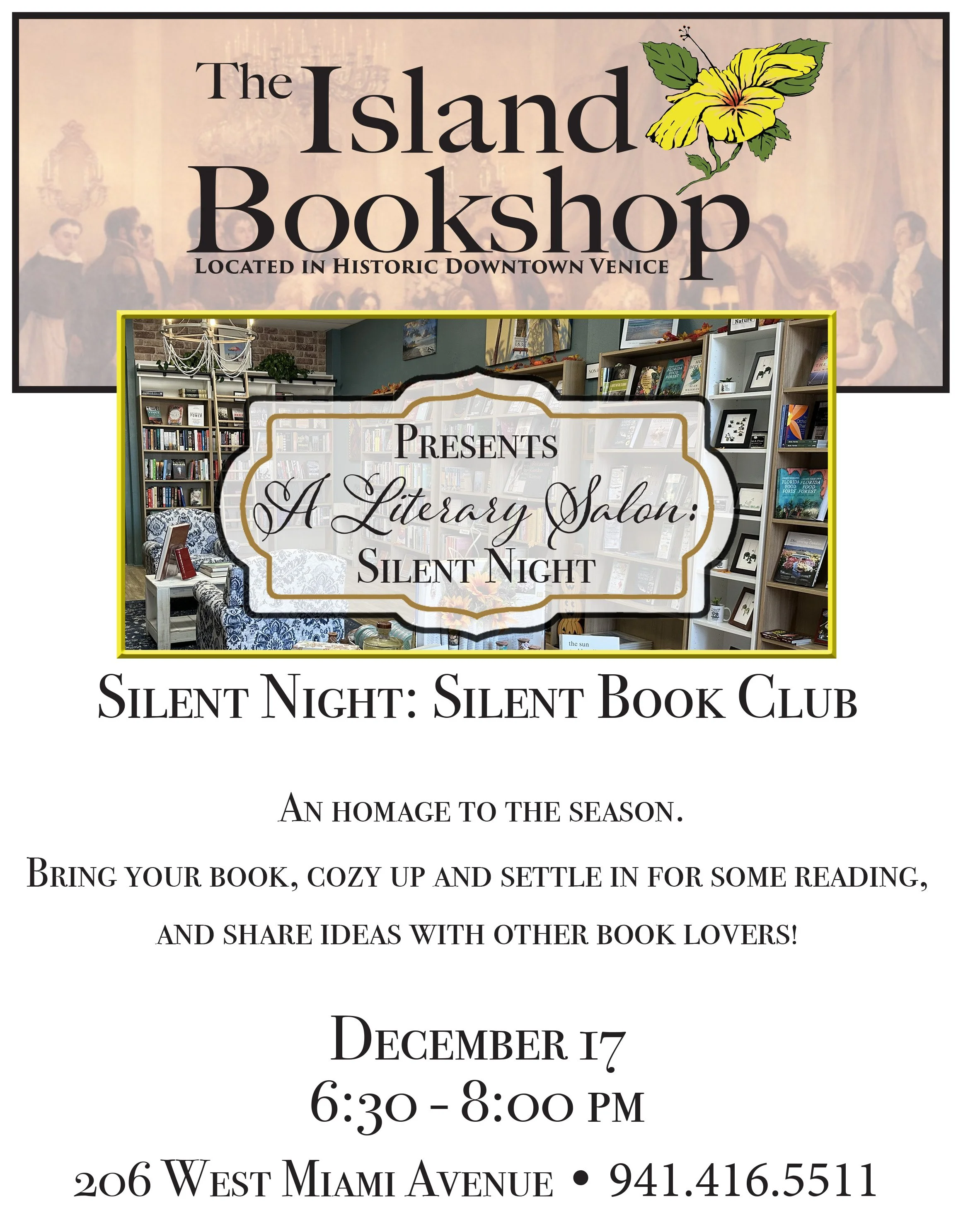 Back to All Events Silent Night: Silent Book Club! Wednesday, December 17, 2025 6:30 PM 8:00 PM The Island Bookshop 206 Miami Avenue West Venice, FL, 34285 United States (map) Google Calendar ICS